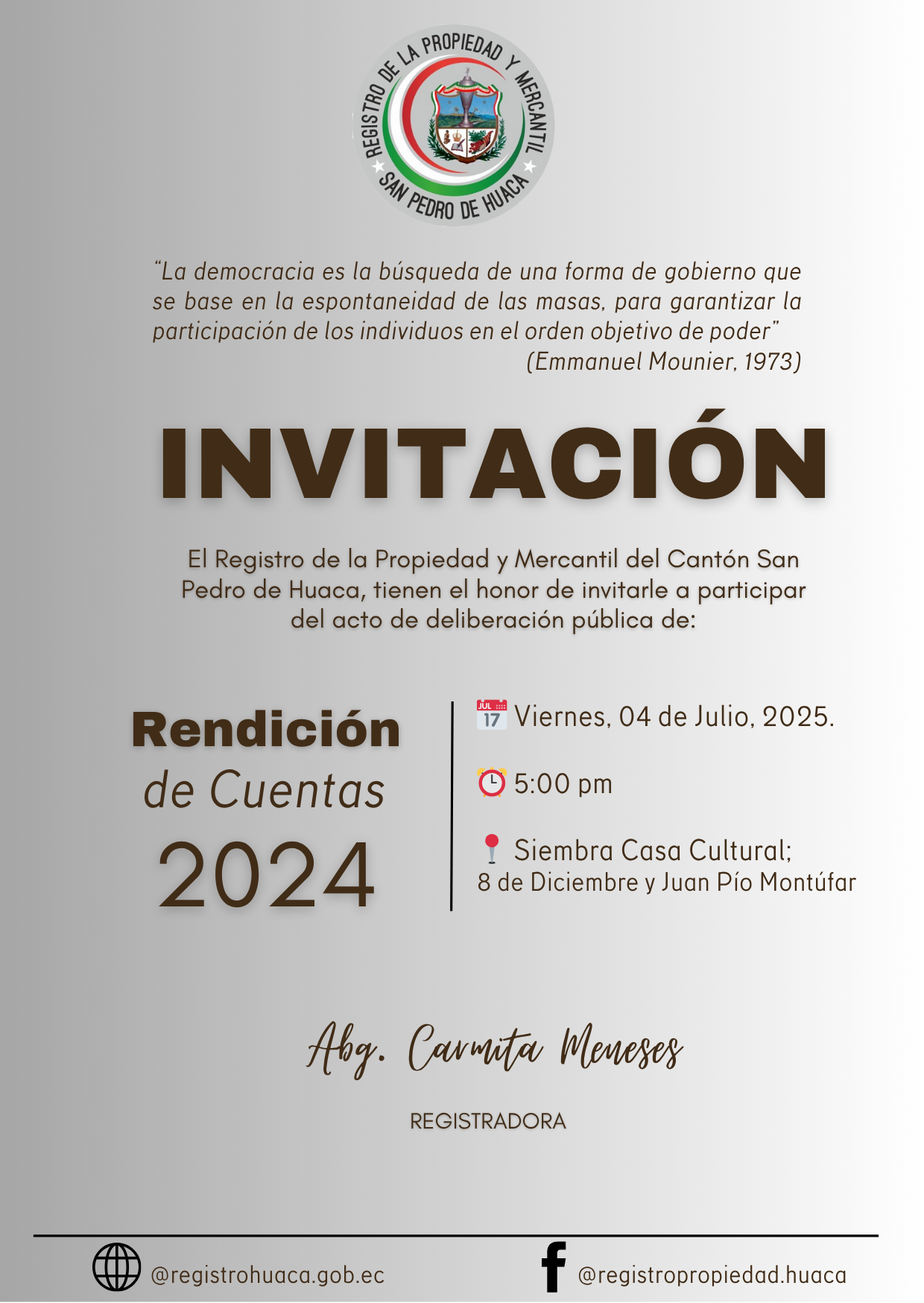 Transparentamos las acciones del Registro de la Propiedad y Mercantil del Cantón San Pedro de Huaca, a través del ejercicio democrático como es la Rendición de Cuentas 2024. Te invitamos a ser participe de este evento.